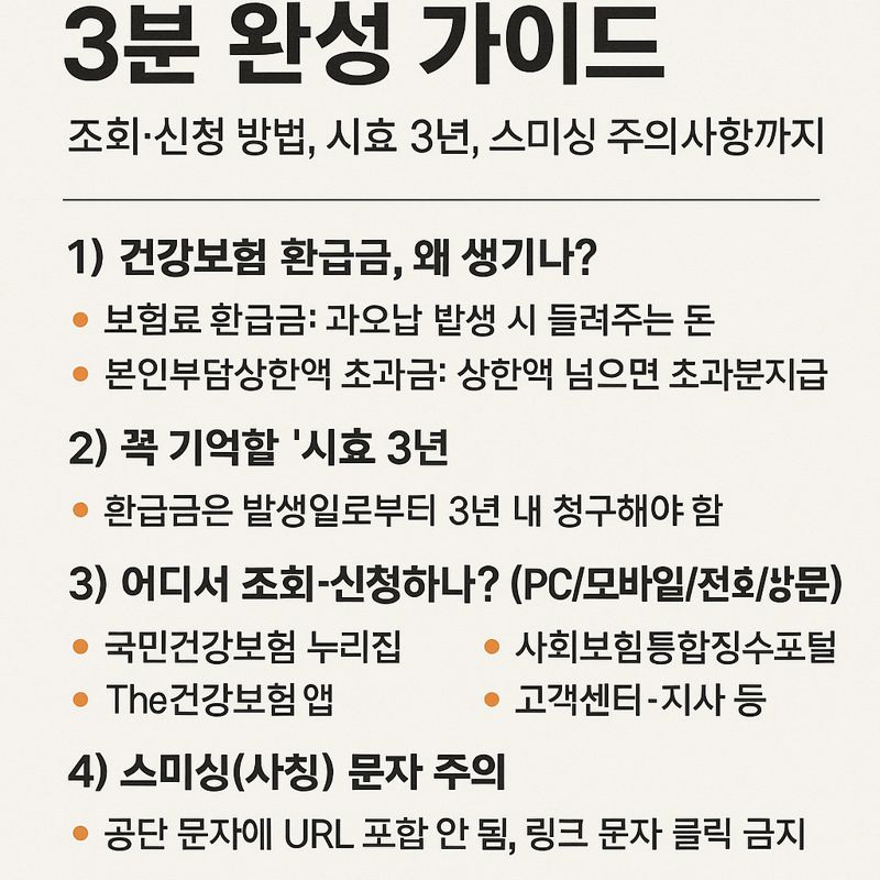 “건강보험료 환급금 조회·신청 방법 총정리. NHIS 누리집/‘The건강보험’ 앱/1577-1000/지사로 간편 신청, 소멸시효 3년·스미싱 주의사항까지 한 번에 확인.”